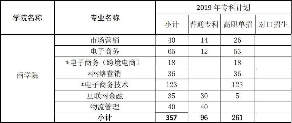 洛阳职业技术学院商学院 2019 年普通招生计划表如下图所示。