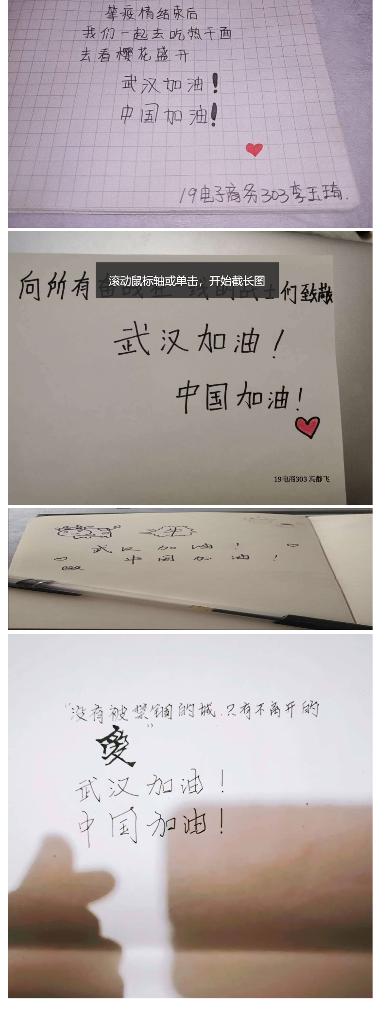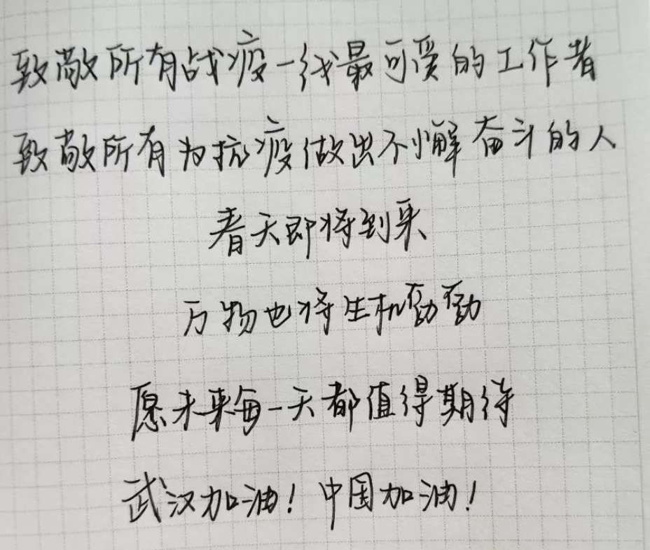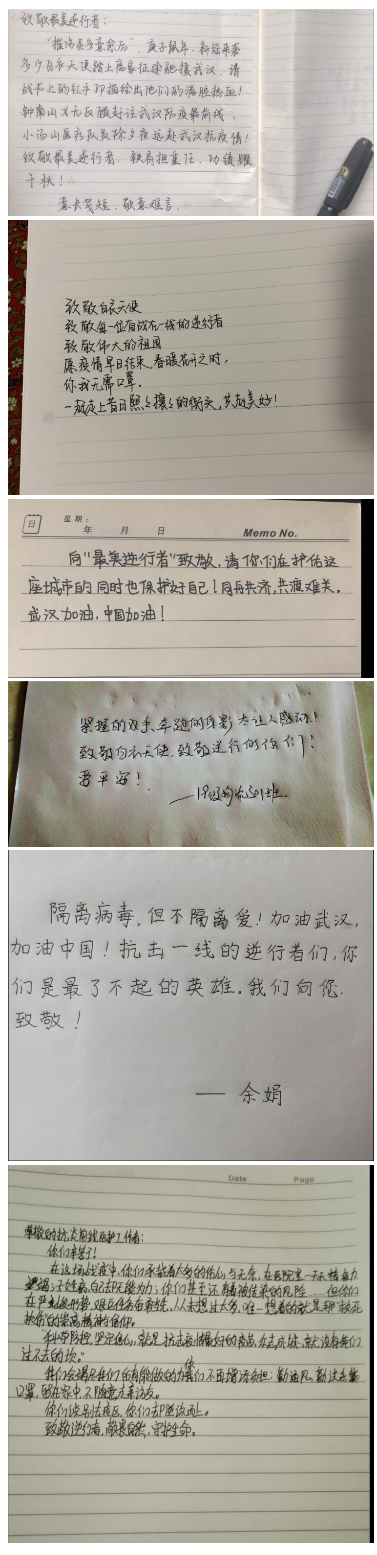 商学院团总支开展了“行动抗击疫情 笔尖传递力量”活动。同学们纷纷拿起纸笔,用手写文字的方式传递祝福, 向坚持奋战在抗疫一线的医护人员和基层的工作人员致敬,为武汉加油,为中国加油。