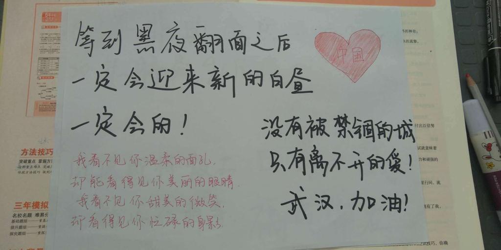 武汉是一座英雄的城市,但一场突如其来的新冠肺炎让他生病了,为了全国各地同胞们的安全,他把自己“关”了起来,安静的配合治疗。洛阳职业技术学院的学生用笔尖拥抱武汉,满含温情写下“武汉加油,中国加油”。