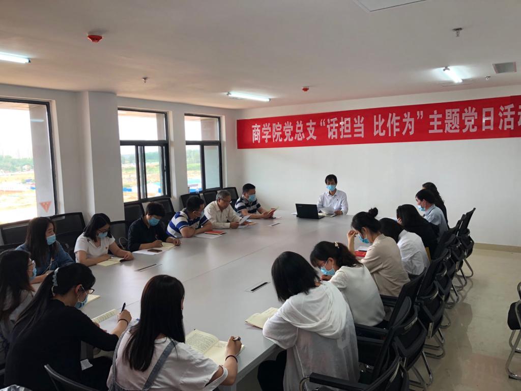 根据洛阳市委组织部和学院党委的安排部署,2020年5月14日下午2:30,商学院党总支全体党员在伊滨校区大学生活动中心四楼商学院会议室隆重举行“话担当、比作为”主题党日活动,活动由商学院总支书记、院长李向直主持。商学院党总支副书记焦海霞带领全体党员学习了王国生书记和尹弘省长在省委省政府加快洛阳副中心城市建设工作推进会上的讲话精神和省委省政府《若干意见》,还学习了洛阳市优秀共产党员马永亮的先进事迹。商学院副院长张靖传达了《中共洛阳市委组织部关于开展党员“话担当比作为”主题党日活动的通知》和学院党委相关文件。全体党员聚精会神学文件、话担当、谈体会,饱含满满干事创业的激情和活力,衷心表达坚守本职不忘初心牢记使命的信心和永远听党话跟党走的决心。