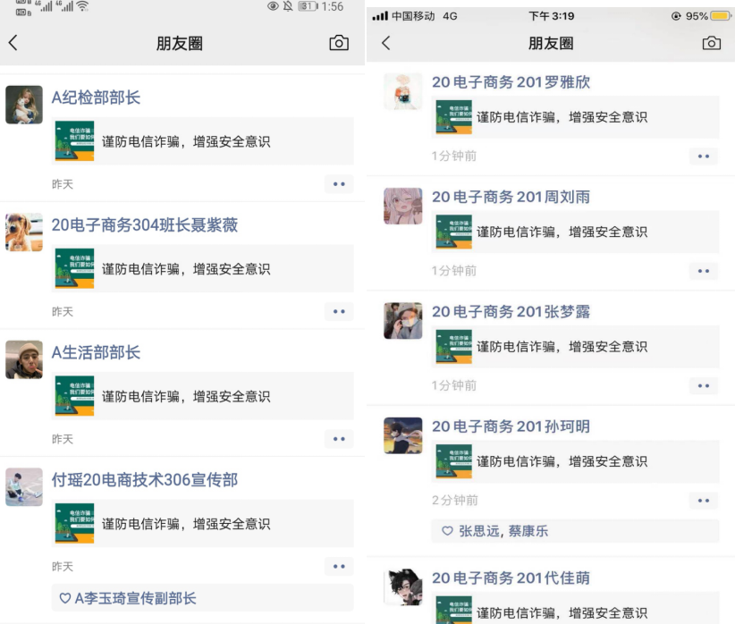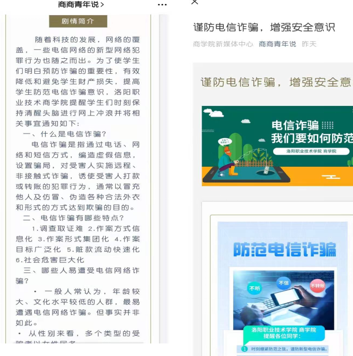 (四)制作宣传海报、在商商青年说发布防诈骗推文并将其转发至班群及朋友圈,做到内容推送全覆盖