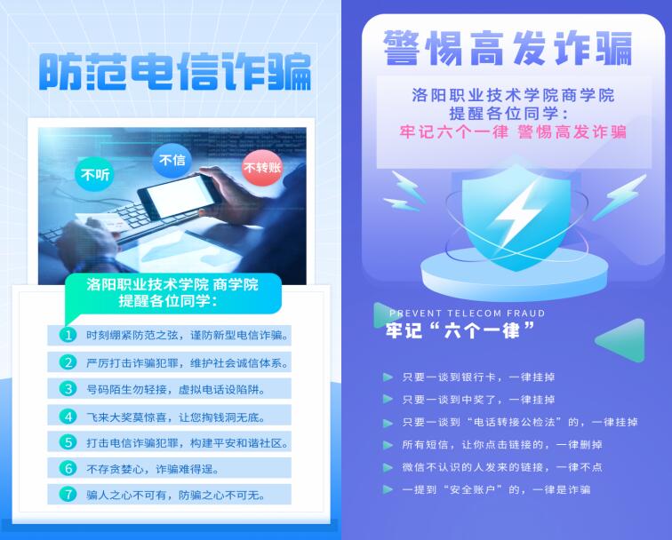为预防和减少校园内电信网络新型违法犯罪的发生,切实提高广大师生及社会公众防诈反诈意识和能力,洛阳职业技术学院商学院2021年春季学期开学以来,积极开展了以“防范电信网络诈骗,加强安全意识”等主题的宣传活动。