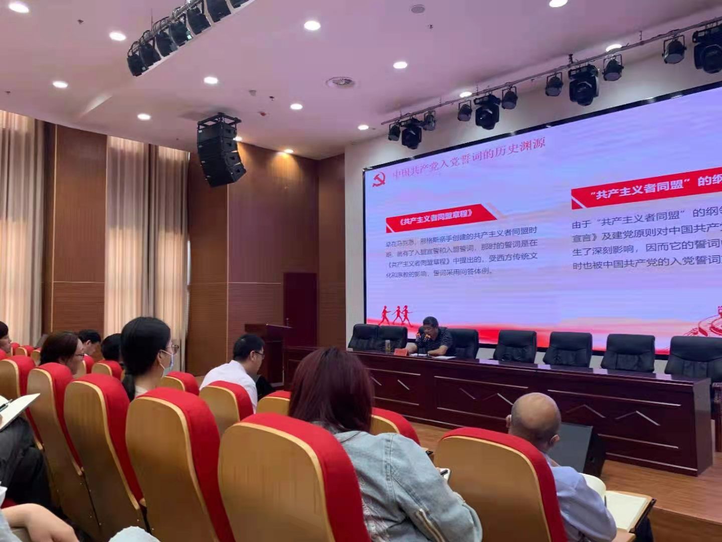 王晓哲讲到,中国共产党入党誓词和中国共产党入党誓词的发展脉络,体现着第一、二次国内革命战争和抗日战争时期、解放战争时期的誓词演变。王晓哲重点讲述了入党誓词对党员的要求,即“志愿”二字昭示着我们入党的初心,“履行党员义务,执行党的决定”包含着守好本分,严格认真,不打折扣的思想,“永不叛党”是共产党人的最高要求等誓词含义。