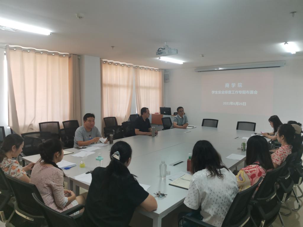 为贯彻落实《关于对校园安全隐患进行排查的紧急通知》和《关于落实抓细抓小抓实全省校园安全工作的通知》,全面排查各类安全隐患,防范重大突发事件发生,保障学校及师生的人身、财产安全,商学院开展持续性安全隐患排查工作。6月26日上午,商学院党总支书记、院长王军华组织召开商学院学生安全排查工作专题布置会。商学院党总支副书记、副院长马选宝,传达学校关于抓小抓实各类学校校园安全的具体要求,并通报25日检查及整改情况,要求全体辅导员、班主任进一步细化排查重点,在假期前高度关注学生各项安全工作,安全排查实行日报告。学工办主任张冰玉、全体辅导员、班主任及相关责任人参会。