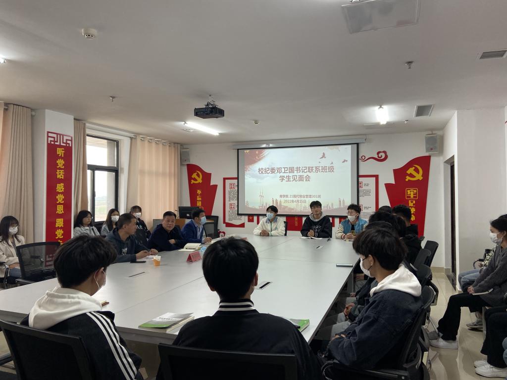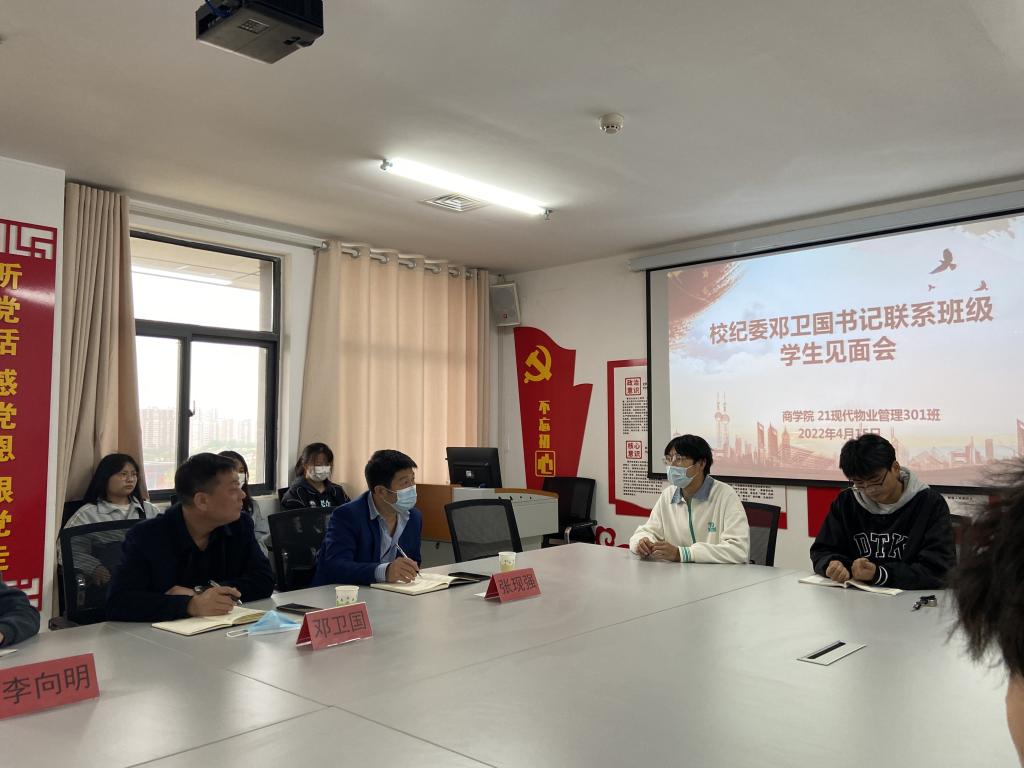 为扎实推进领导干部联系班级制度,深入了解把握学生在校的学习、生活、思想状态,广泛听取学生对学校发展的意见建议,4月15日下午,校党委委员、纪委书记、监察专员邓卫国在大学生活动中心403党建活动室主持召开联系班级学生见面会,2021级现代物业管理专业301班全体在校学生参加。