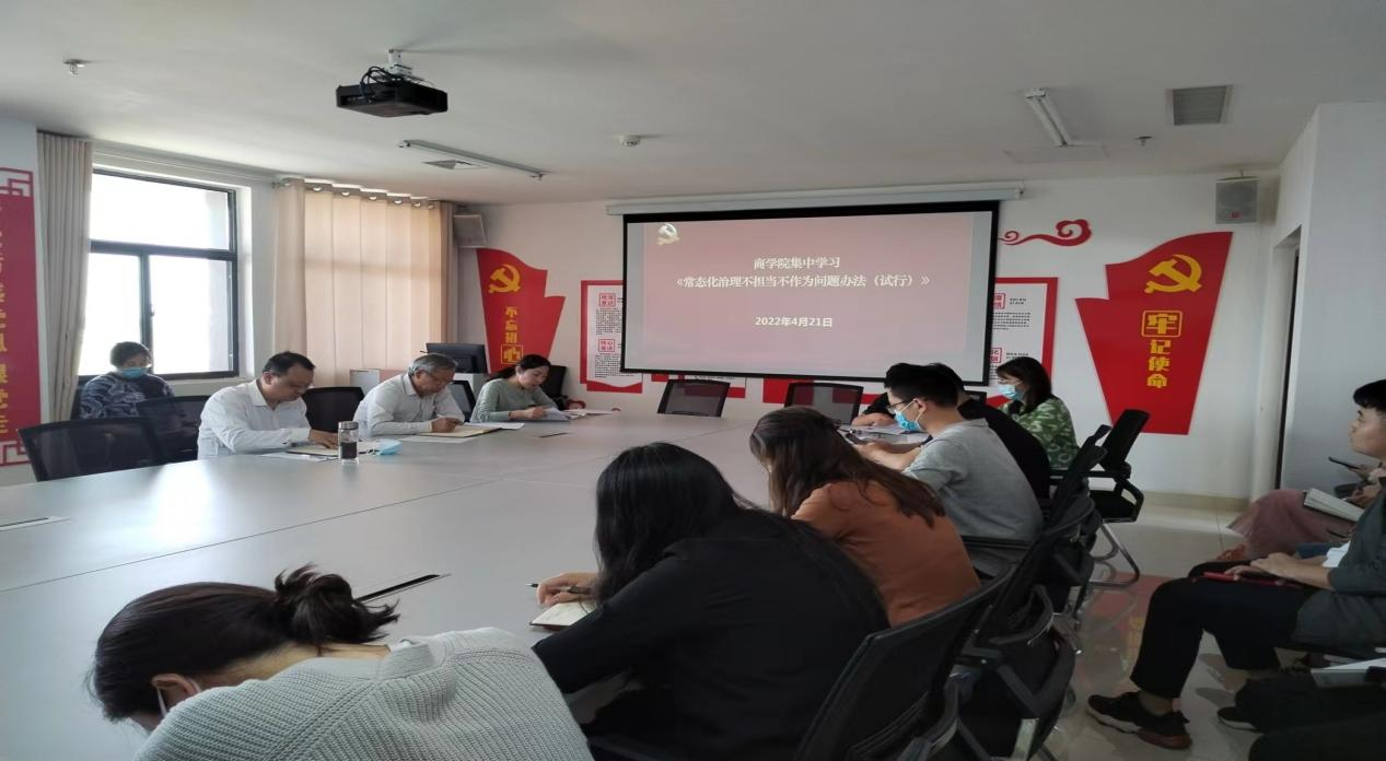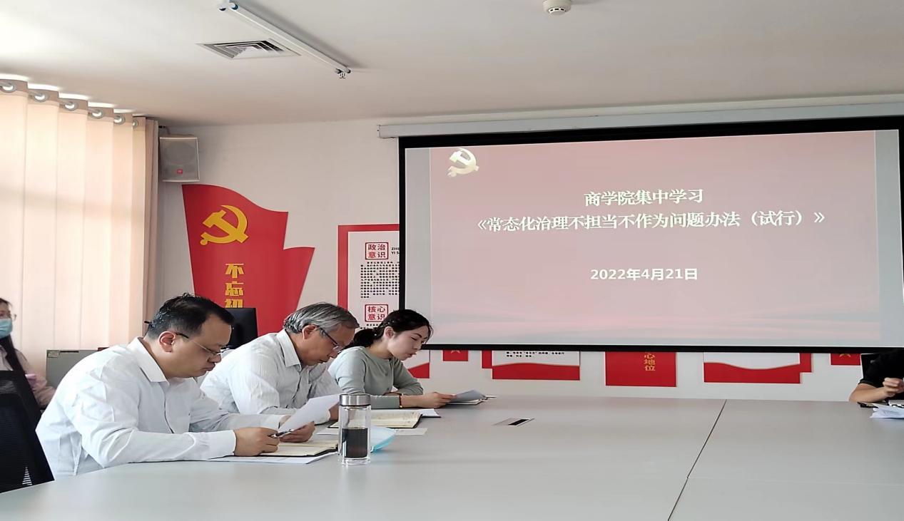 4月21日下午,为激励商学院全体教职工担当作为,同时治理不担当不作为问题,商学院组织全体教职工在大学生活动中心四楼会议室集中学习学校《常态化治理不担当不作为问题办法(试行)》,此次学习由商学院党总支副书记李双双领学。