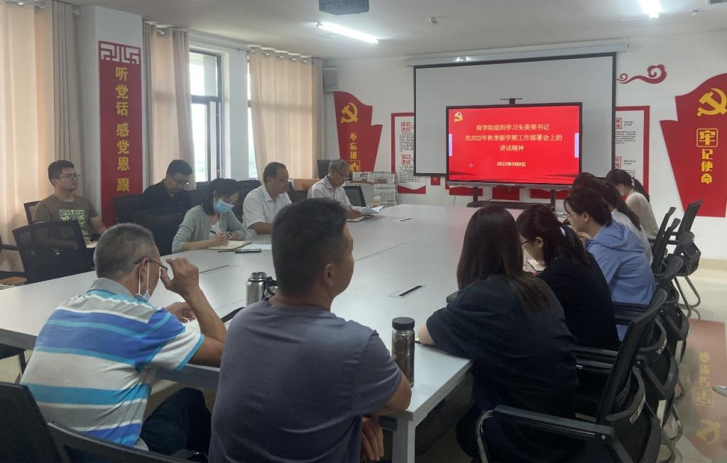 会上,王军华首先向全体教职工致以节日的祝福。随后,王军华、商学院副院长张靖分别领学了学校党委书记朱美荣和院长赵健在2022年秋季新学期工作部署会上的讲话精神。