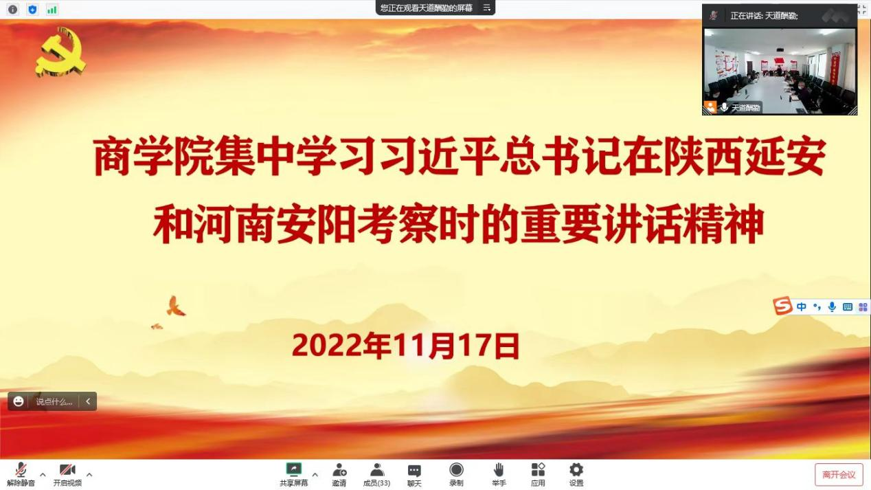 11月17日下午,商学院全体教职工在大学生活动中心党建会议室以线上线下同步的形式召开学习宣传贯彻党的二十大精神会议。会议由商学院院长王军华主持。