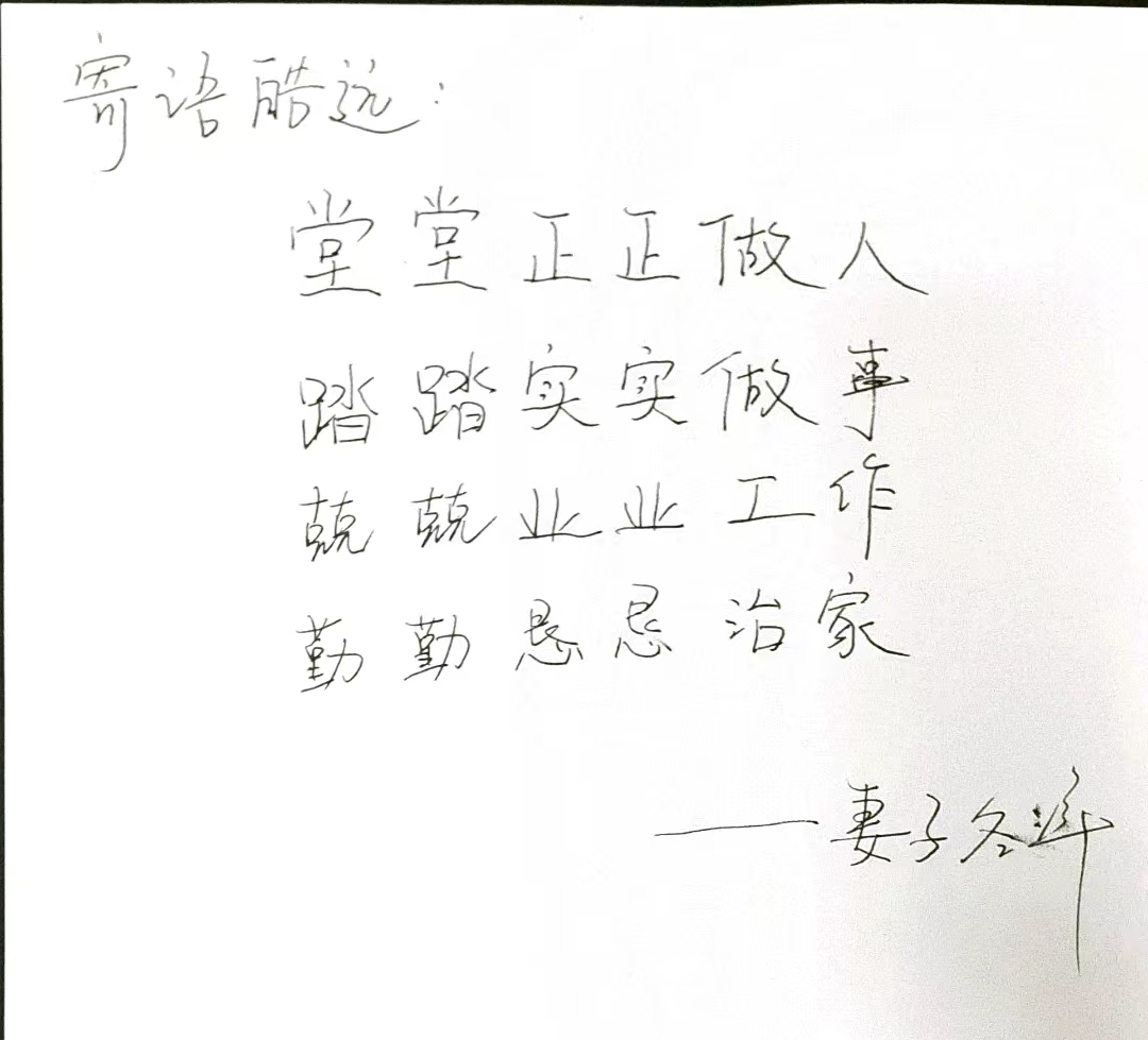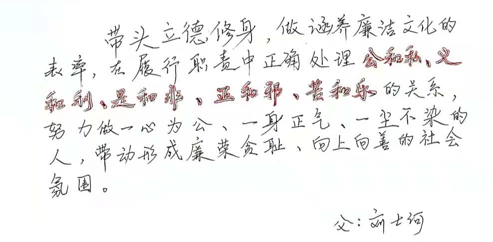 征集到的廉情寄语中,既有长辈对晚辈的嘱托和叮咛,也有夫妻之间的理解和提醒,还有孩子用稚嫩的话语对父母表达崇敬和祝福。现将部分优秀廉政寄语进行展示。
