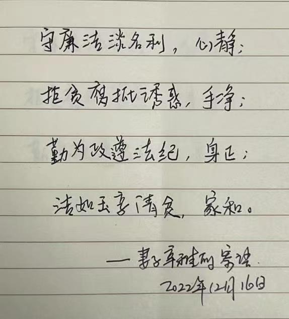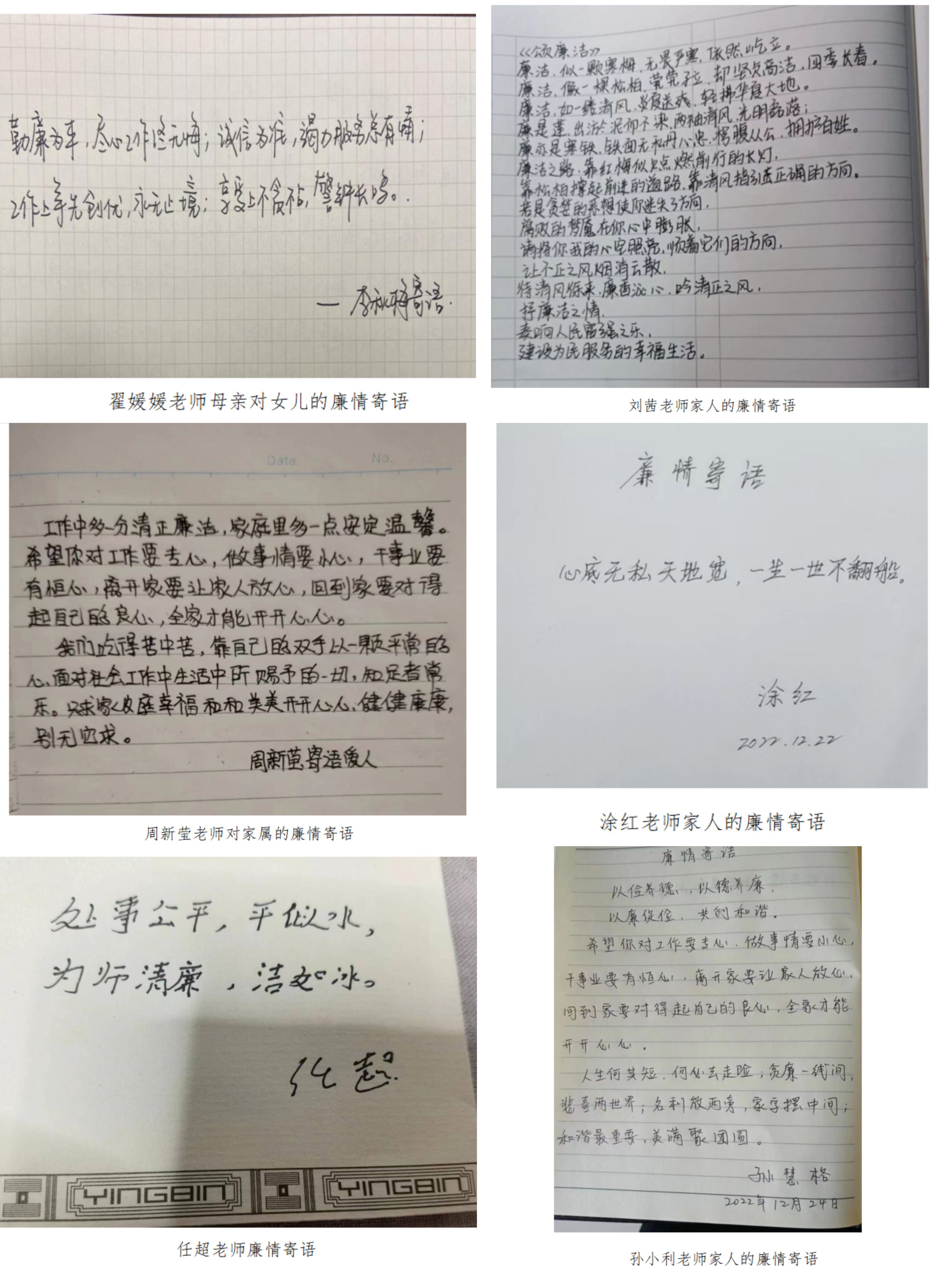 为深入学习贯彻习近平总书记关于注重家庭、注重家教、注重家风的重要论述,落实十九届中央纪委六次全会关于加强家风家教建设的部署要求,发挥“廉洁家风监督员”作用,以家风促党风政风,带动院风政风向上向善。根据上级纪委第四季度警示教育内容安排,为进一步深化学院廉洁家风建设,商学院于2022年12月中下旬开展“清风满家 亲情助廉”廉情寄语活动,此次活动得到了全体教工及家属的支持,他们纷纷拿起手中的笔,书写一条条有温度有力度的廉情寄语,为家人写下廉情寄语。