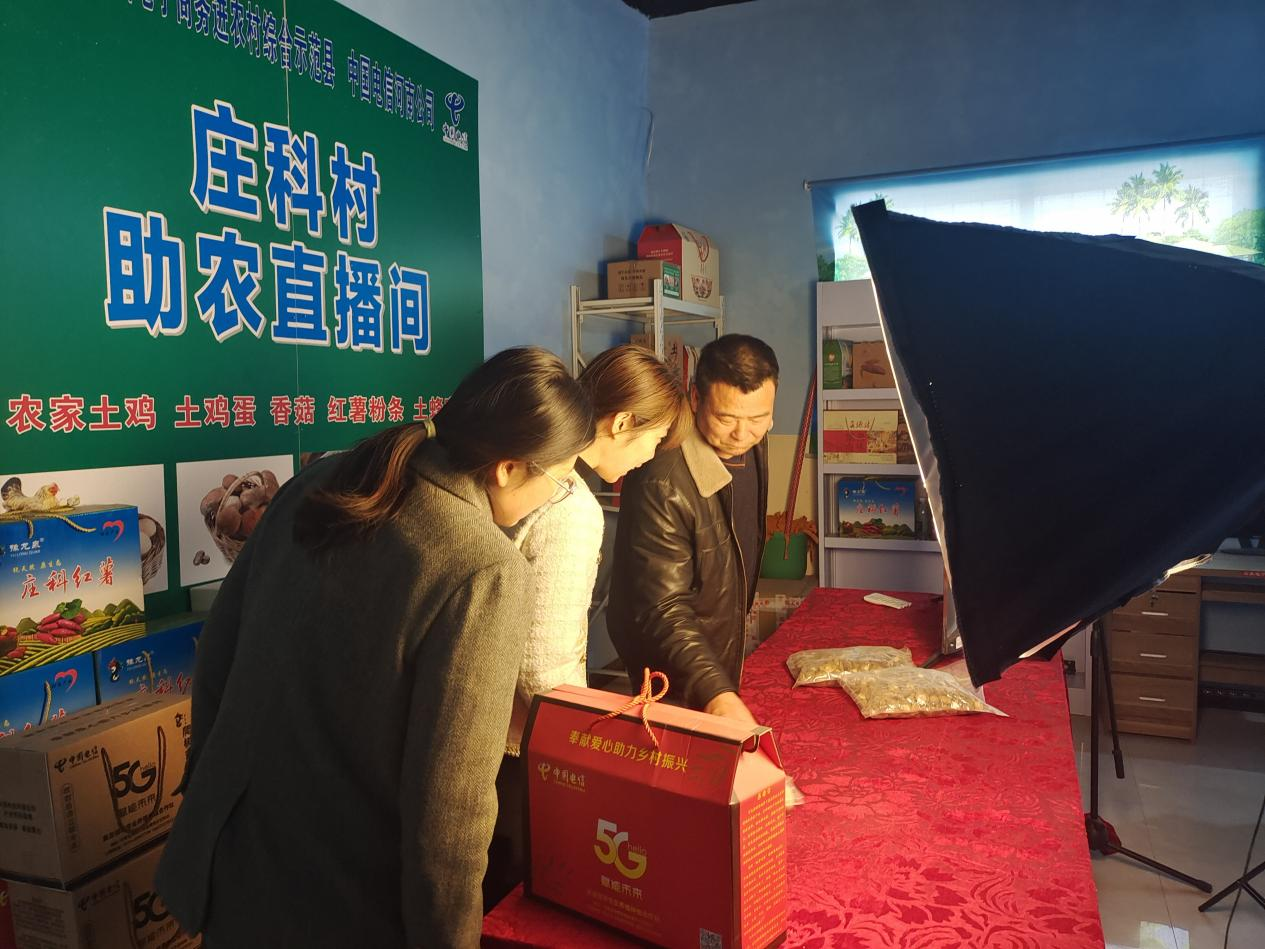 随后助农团来到黄庄乡庄科村电商综合服务站,现场查看电商服务站的设备配置,了解站点的运营情况,在参观服务站布置的电商直播间时,庄科村村支书金海芳说道:“前几年,村里花了很大的精力想培养直播团队,最终效果不好,精心打造的直播间一直没派上用场,希望之后在学校专业老师的帮助和指导下,培养自己的直播队伍,把直播间给用上,给村里面再带来新收入!”
