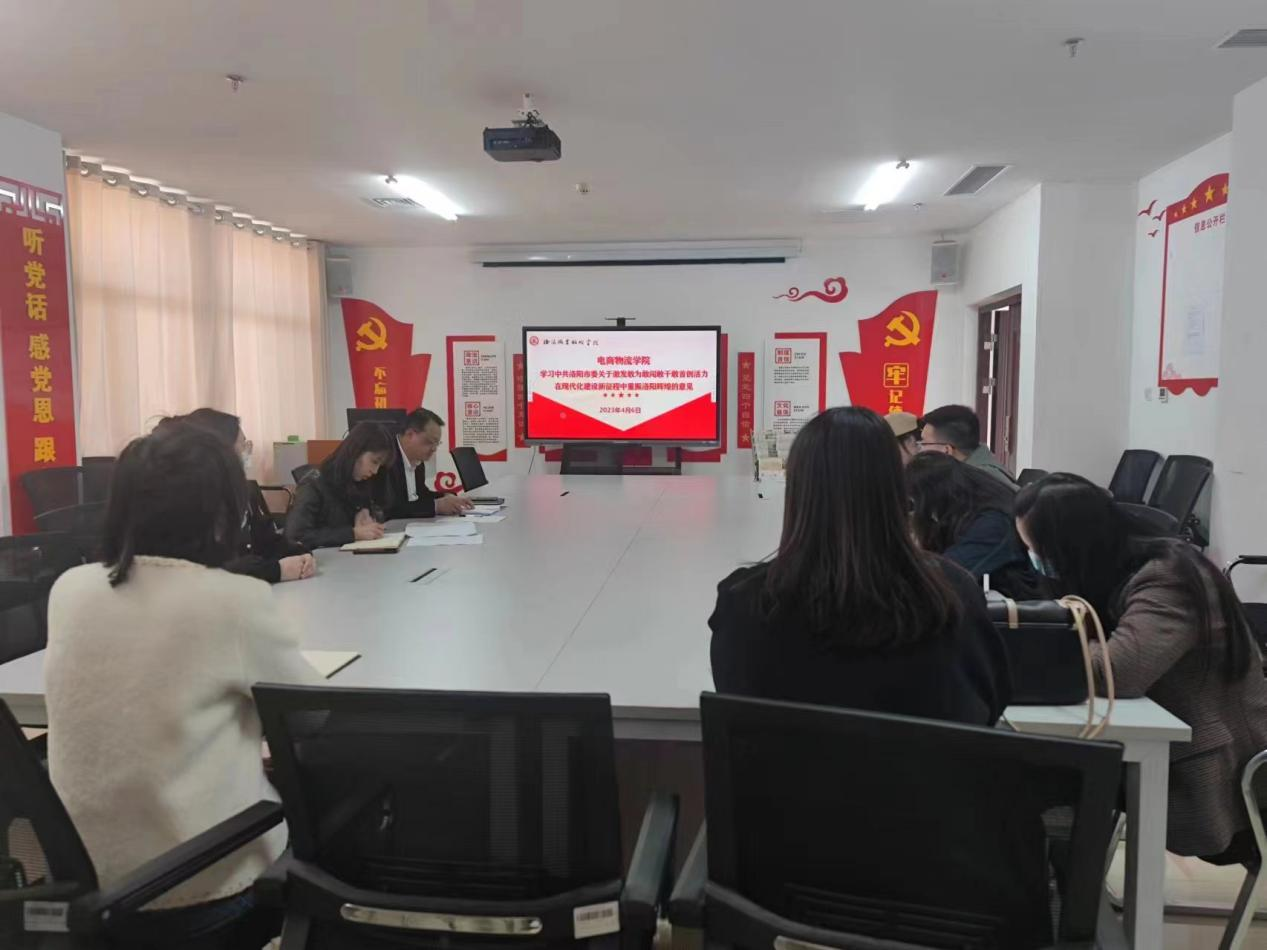 为深入贯彻习近平总书记关于“让干部敢为、地方敢闯、企业敢干、群众敢首创”的重要要求,激发广大干部担当作为、奋勇争先的使命感责任感紧迫感,共谋出彩的积极性主动性创造性,4月6日下午,电商物流学院党总支在大学生活动中心403会议室学习《中共洛阳市委关于激发敢为敢闯敢干敢首创活力 在现代化建设新征程中重振洛阳辉煌的意见》,会议由电商物流学院党总支副书记李双双主持。