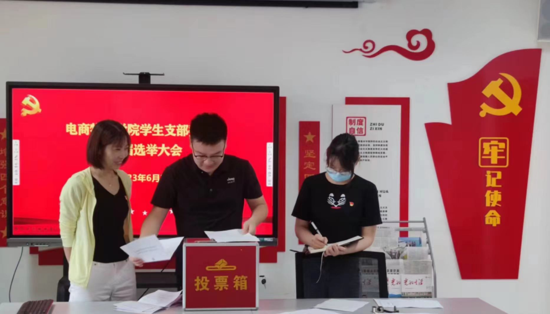 大会在庄严的国歌声中拉开帷幕,张冰玉代表上一届学生党支部委员会进行工作述职。随后依次听取并通过了选举办法、监票人和计票人名单,经全体党员无记名投票,选举张冰玉、翟媛媛、黎巧粉为新一届学生党支部委员。后经新一届学生党支部委员会召开第一次会议,选举张冰玉为学生党支部书记。