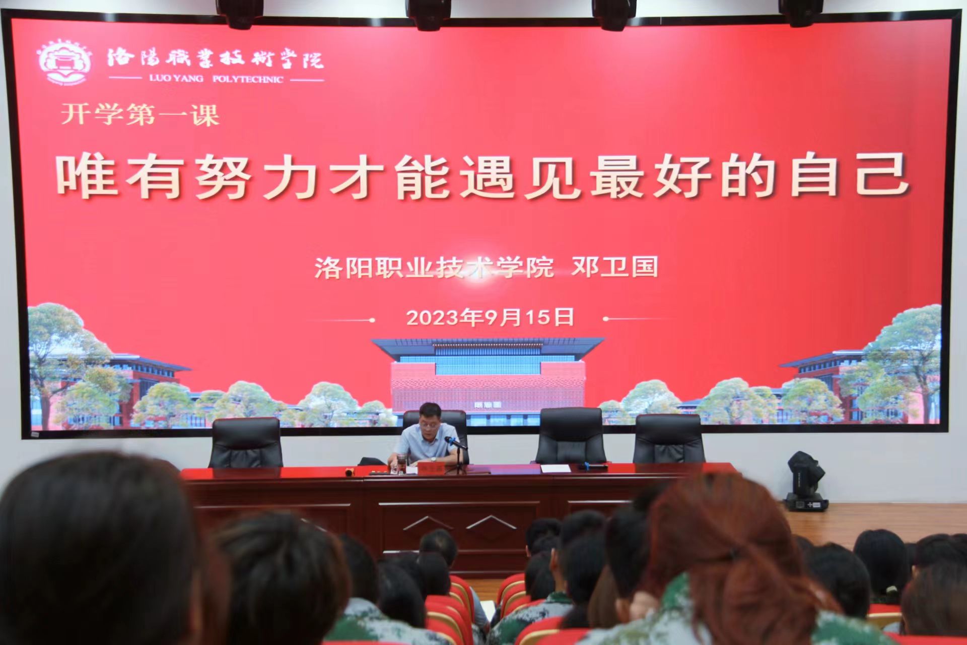 在开学第一课上,邓卫国首先表达了对新生的期盼,并向新生介绍了学校的历史、教师队伍、学科专业建设、学生竞赛获奖等各方面情况,指出了洛阳职业技术学院值得同学们选择,并激励新生要用好大学时光,与大家携手并进,共创美好未来。