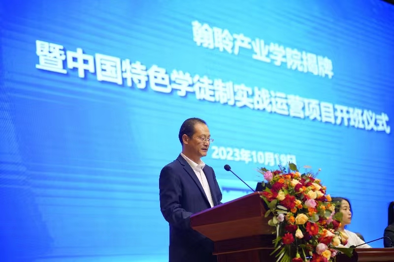 上海翰聆信息技术有限公司总经理徐智慧在致辞中介绍了翰聆的发展历程和企业文化,赞扬了学校近年来校企合作的办学成就,表达了对翰聆产业学院的合作育人的责任担当。他期望产业学院项目中同学们在实训期间能够积极地参与项目工作,从项目实战中获得宝贵的专业技能和职场经验,体验从学生、学员到职场人的角色转变。