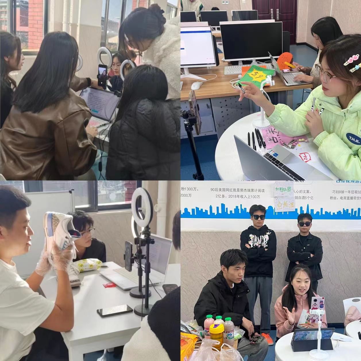 整个实训期间,同学们在直播账号开设、直播标题设置、平台规则了解、视频创意流程、短视频拍摄上传、商品上架小黄车、开播前灯光调试、镜像等功能的设置,憋单逼单、活跃直播间氛围等操作的各个环节都进行了充分实践。大家依据小组顺序轮流模拟演练,从一开始的稍显生疏到逐渐适应镜头感,从容大方的介绍商品,根据粉丝提出的问题随机应变,整个过程有条不紊,同时整体氛围激情满满。