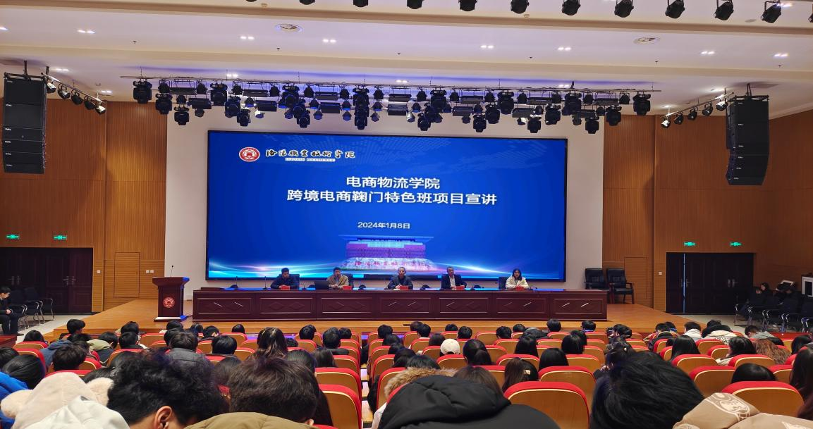 为探索“双主体”育人校企合作机制实践,推进“岗课赛证创”育人模式改革,培养国际化创新型高素质跨境电商专业技术技能人才,1月8日下午,电商物流学院在大学生活动中心一楼会议厅举办跨境电商鞠门特色班项目宣讲会,会议由电商物流学院党总支书记房长显主持,电商物流学院院长王军华、党总支副书记李双双、上海鞠门贸易有限公司董事长豆勇以及电子商务教研室主任、骨干教师、2022级电子商务专业全体同学参会。