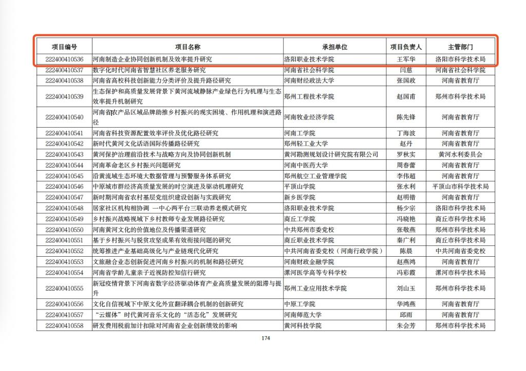 近日,河南省科学技术厅发布《关于下达河南省二O二二年科技发展计划的通知》,商学院院长王军华主持的《河南制造企业协同创新机制及效率提升研究》获批河南省软科学研究项目,这是商学院首个主持申报获批的省级科研项目,我院科研工作获得突破性进展。