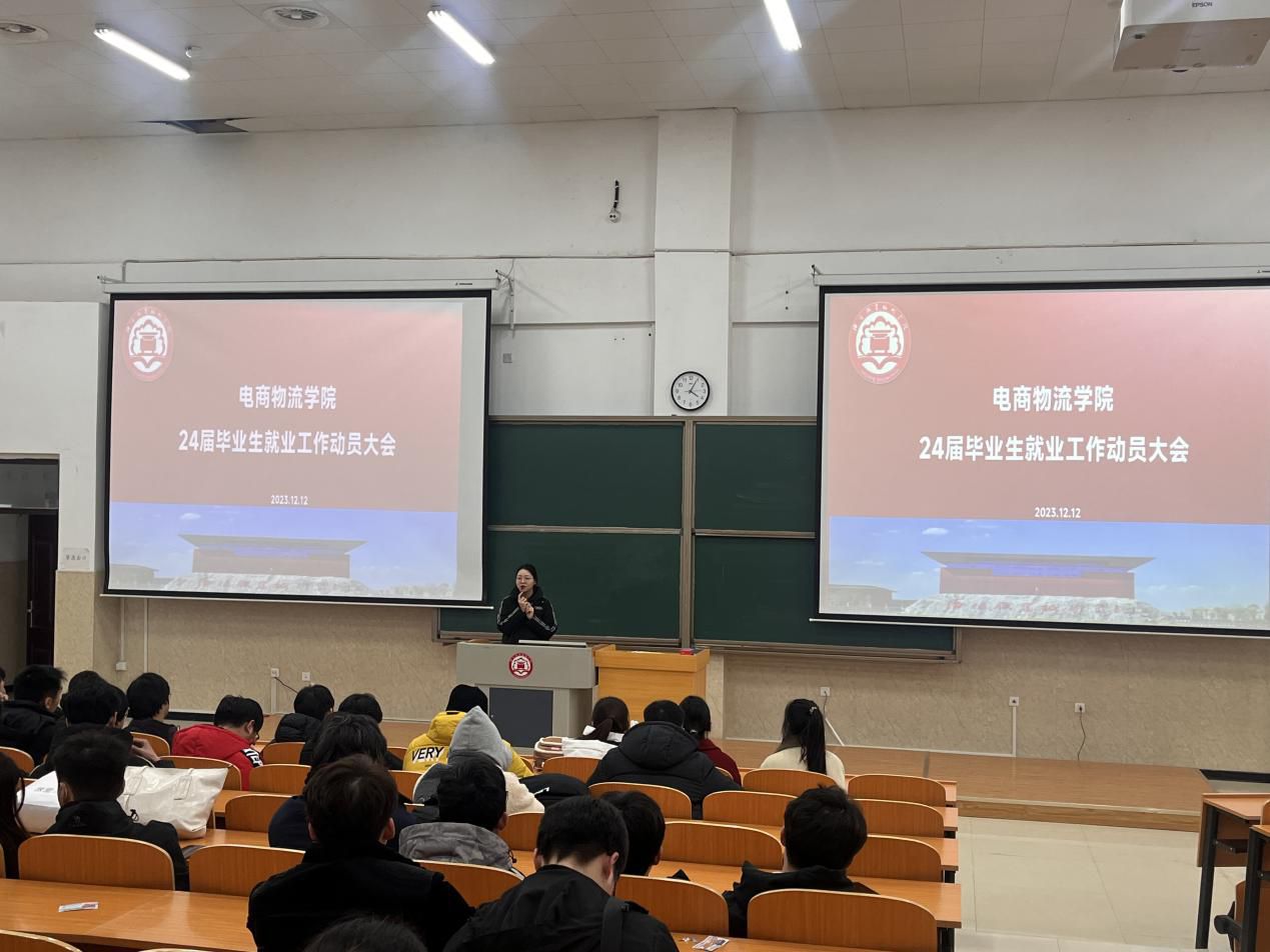 为引导2024届应届毕业生明确发展方向,了解当前就业形势,解决就业问题与困惑,我院于12月12日下午在5-410教室举办了电商物流学院2024届毕业生就业工作动员会,学工办主任张冰玉、就业专员杨杰老师为同学们做讲解动员,2024届毕业生参加会议。