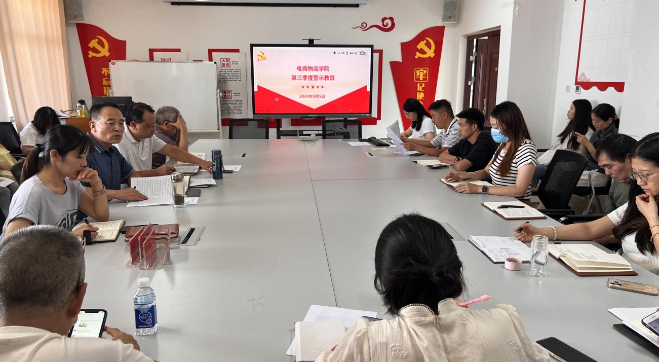 为认真贯彻落实党的二十届三中全会和中央、省、市纪委全会精神,按照学校关于组织开展2024年第三季度警示教育工作要求,教育引导党员干部和教职员工在进一步全面深化改革、推进中国式现代化新征程中树立和践行正确政绩观,牢记初心使命,严守纪律规矩,开拓创新、积极作为,9月5日下午,电商物流学院在大学生活动中心403会议室进行2024年第三季度警示教育。会议由电商物流学院党总支书记房长显主持,全体教职工参加。