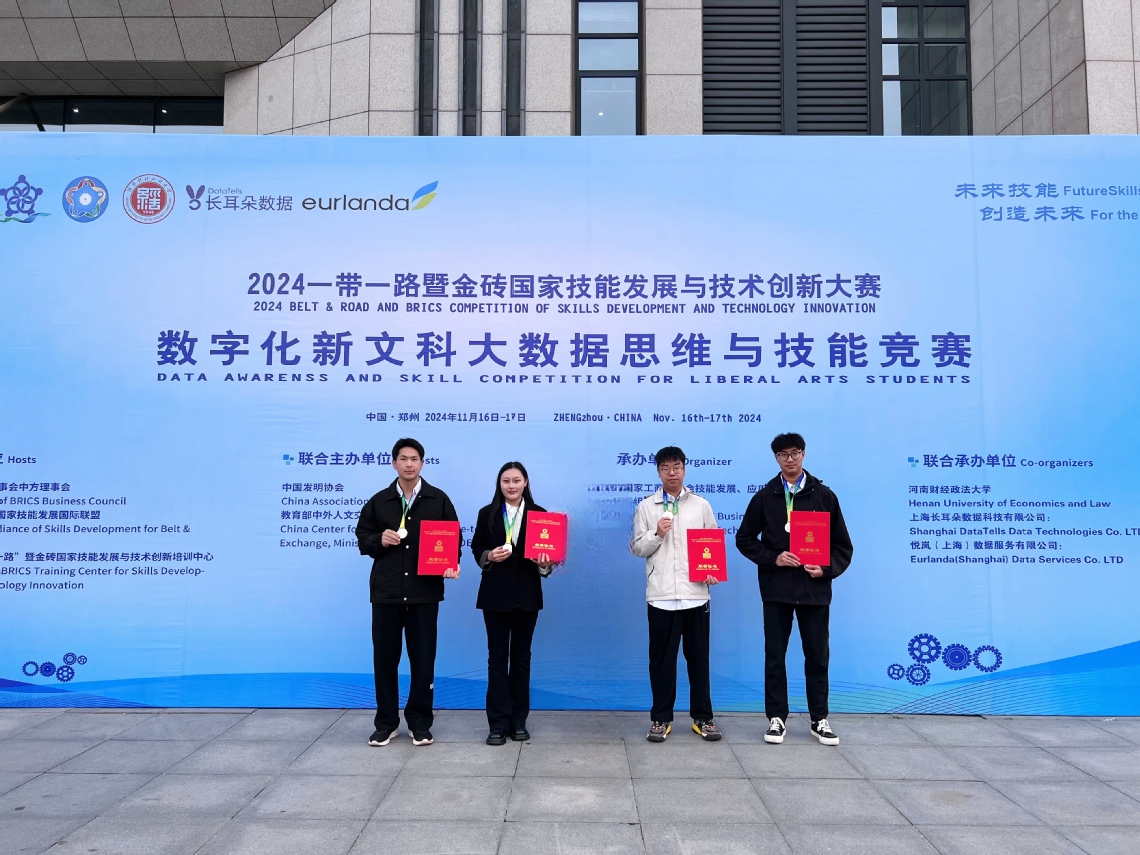 11月17日,在2024一带一路暨金砖国家技能发展与技术创新大赛数字化新文科大数据思维与技能竞赛项目全国总决赛中,电商物流学院路航、杨卓、赵欣悦、陈家旺四位同学,经过激烈比拼,荣获高职组国赛二等奖,江东芳、王格格两位老师获“优秀指导老师”奖。
