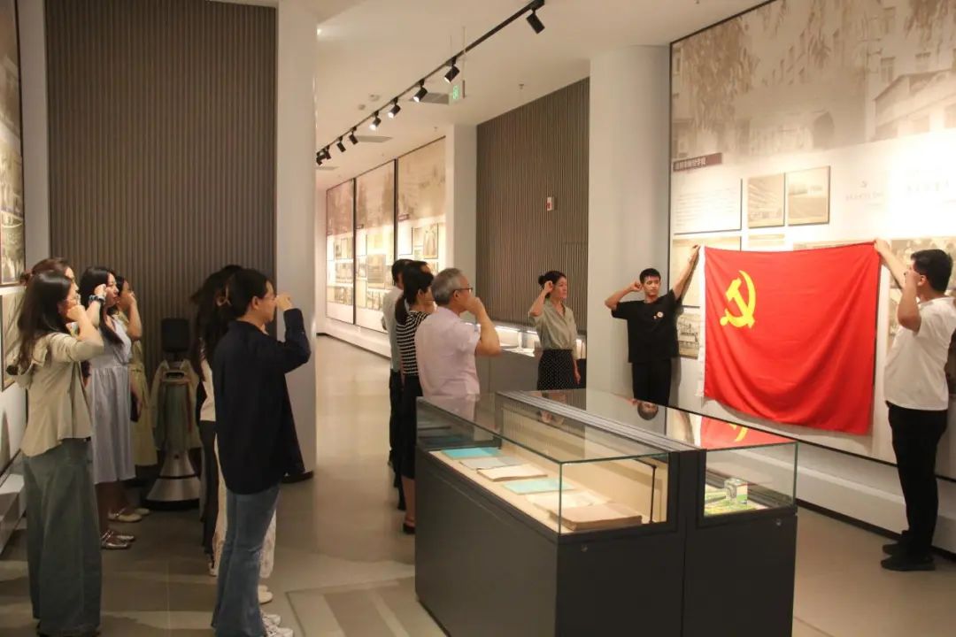 全体教师党员在校史馆前,面向鲜红的党旗,举起右拳庄严宣誓,“我志愿加入中国共产党,拥护党的纲领,遵守党的章程,履行党员义务......”。铿锵有力的誓言在校史馆内回荡,彰显着党员们对党的忠诚和坚定信念。