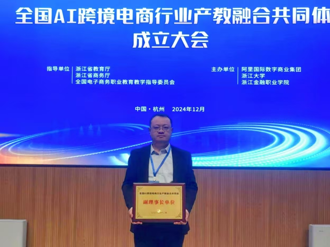 2024年12月3日-5日,全国AI跨境电商行业产教融合共同体成立大会在杭州成立,我校当选副理事长单位。