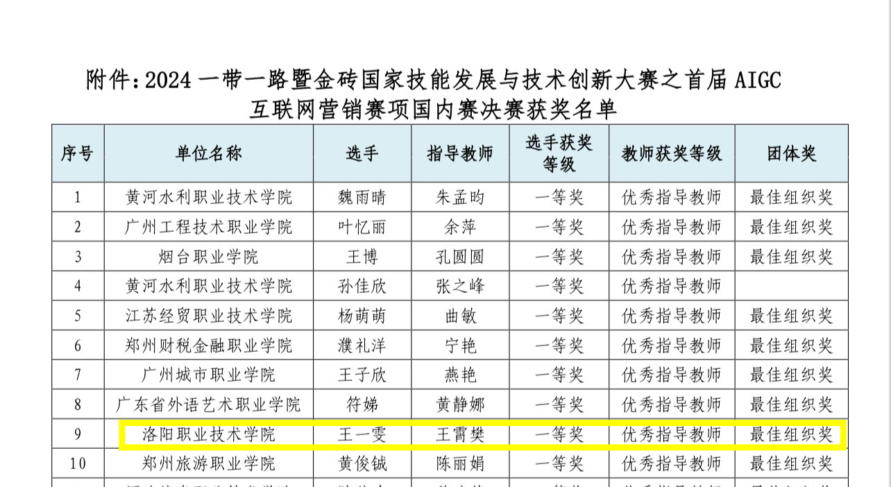 11月29日至12月1日,在2024“一带一路”暨金砖国家技能发展与技术创新大赛首届AIGC互联网营销赛项全国总决赛中,电商物流学院23级网络营销与直播电商专业的王一雯同学以第九名的优异成绩斩获国赛一等奖。青年教师王霄樊荣获“优秀指导老师”,洛阳职业技术学院荣获“最佳组织奖”。