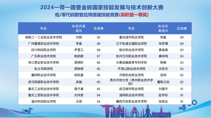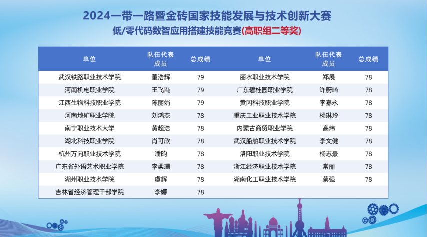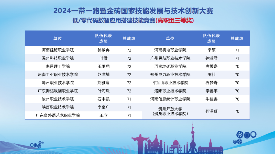 11月29日至11月30日,在2024一带一路暨金砖国家技能发展与技术创新大赛第二届零代码数智应用搭建赛项全国总决赛中,电商物流学院24级现代物流管理专业的赵宇彤、崔浩瀚、郭世洲同学经过激烈比拼,斩获国赛一等奖,周新莹、任超两位老师荣获“优秀指导教师”,洛阳职业技术学院荣获“最佳组织奖”。电商物流学院23级现代物流管理专业的杨志豪、王一航、冯威量荣获国赛二等奖,张卫国、王军华两位老师荣获“优秀指导教师”,洛阳职业技术学院荣获“优秀组织奖”。电商物流学院23级现代物流管理专业的李鑫宇、韩文灿、袁精数荣获国赛三等奖,指导教师为范艳艳、周新莹。
