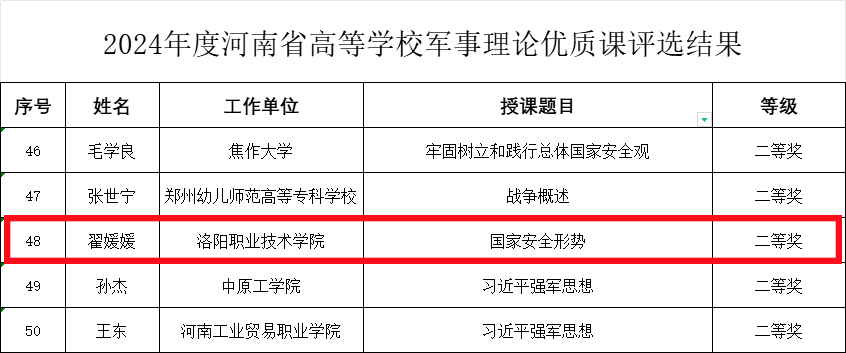 近日,根据河南省军区战备建设局公布了«2024年河南省高等学校军事理论优质课评选结果»,我院教师翟媛媛所授课程«国家安全形势»凭借出色的教学表现,荣获2024年度河南省高等学校军事理论优质课二等奖。