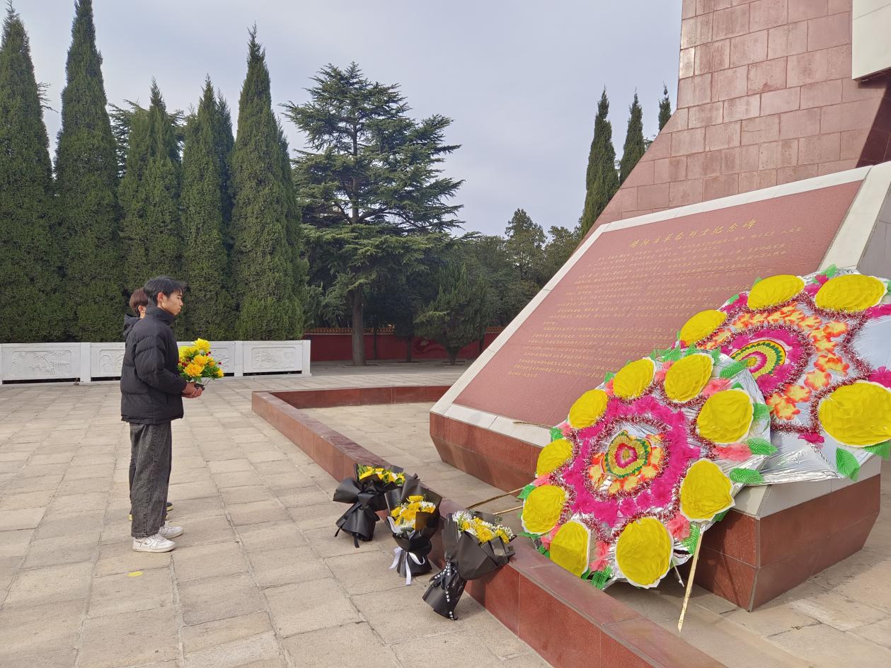 活动当天,阳光遍洒洛阳市烈士陵园,却难抚众人对沉痛历史的哀伤。革命烈士纪念碑前,同学们怀着对英烈们的缅怀与敬仰,站在烈士墓碑前全体肃立,集体默哀三分钟,并向烈士行三鞠躬礼,为革命先烈敬献花束,以表对先烈们的深切缅怀与无尽敬意。