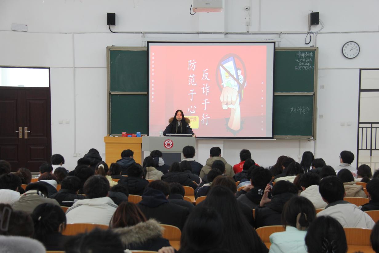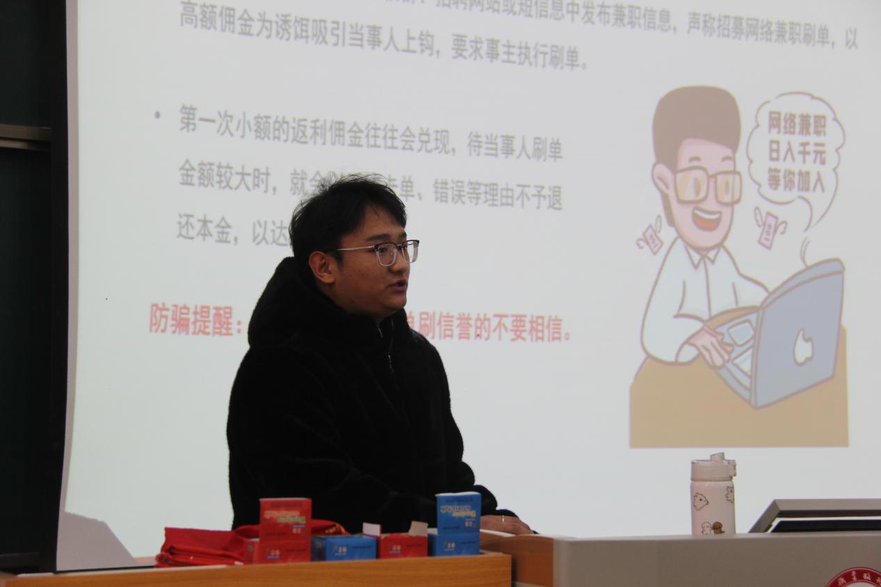 为提高同学们的防范意识,共同打击电信网络诈骗,传达防骗知识,12月19日,电商物流学院团总支面向各团支部开展反诈安全教育主题班会。会上,为大家列举了身边常见的诈骗类型,如:刷单、校园贷、网络兼职等,借此告诉大家网络诈骗手段层出不穷,希望大家时刻保持警惕。并强调“不轻信,不透露,不转账”,遇事要沉着冷静,若遇到诈骗需第一时间要告知辅导员,并积极主动拨打110电话寻求警察帮助。