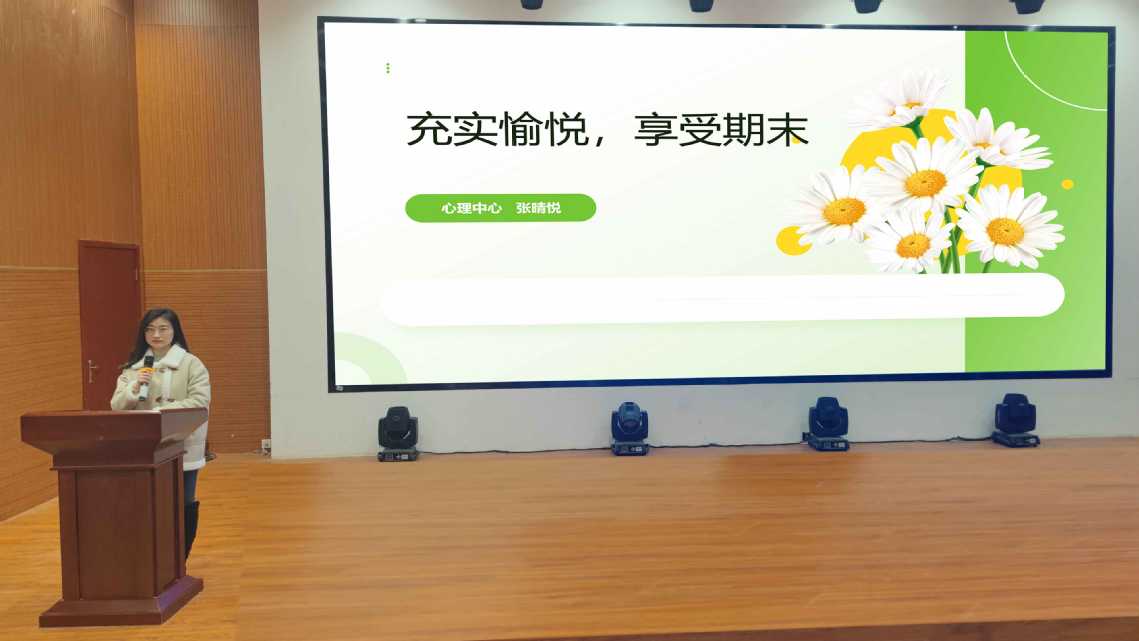 为帮助学生缓解期末考试压力,以积极健康的心态迎接考试,12月26日,校学生心理健康教育发展中心张晴悦老师在大学生活动中心2楼心理剧场,为电商物流学院学生开展主题为“充实愉悦,享受期末”的心理讲座。