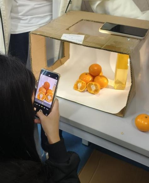 师生通过自制静物台,训练低成本布光能力,利用手机摄影培养移动端视觉呈现技巧,并结合商品材质特性掌握物品高反光等技法,全方位锻造学生“拍-修-策”的岗位胜任力。“没想到废纸箱能变成专业摄影台!通过实践我真正理解了不同材质商品的布光逻辑。”一位学生兴奋地展示着自己的作品。学生们积极在改造的快递箱静物台上调试光影,通过实践不仅掌握了构图技巧,更提升了数字经济时代“变资源为价值”的核心竞争力。