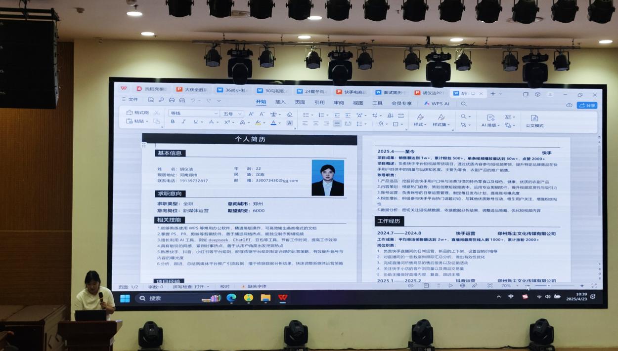 比赛现场,参赛选手通过PPT演讲、个人求职简历深度展示了个人及团队的实战项目。学子们以逻辑清晰的框架、精确的数据支撑和富有创意的设计,将课堂所学转化为可落地的策划方案,也将个人的专业技能、实践经历和职业规划清晰呈现。同时,选手们结合洛阳文旅汉服产业、原生态农产品、直播等热点议题,不仅展现了同学们良好职业素养和求职竞争力,还尽展出对行业痛点的敏锐洞察。
